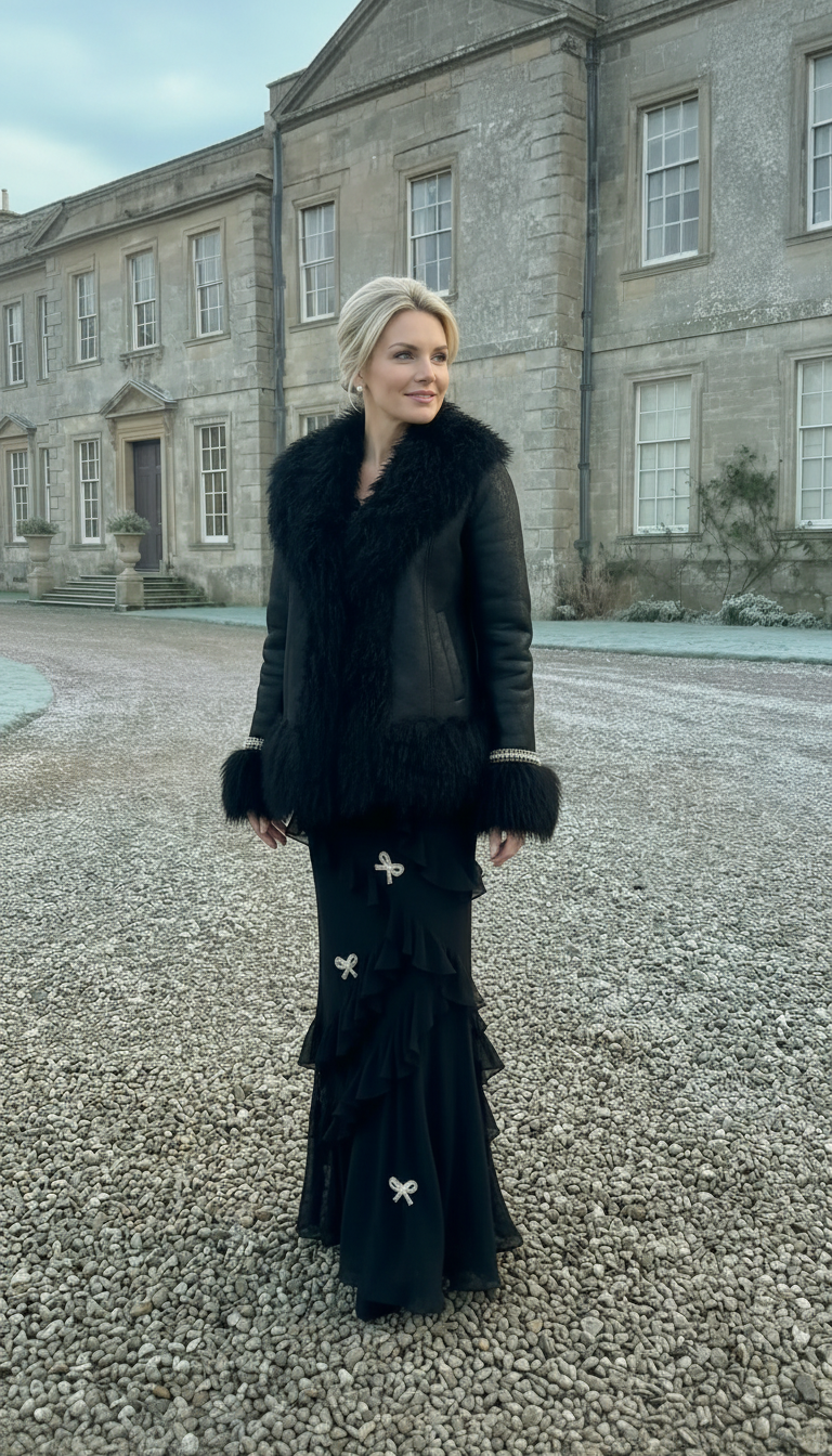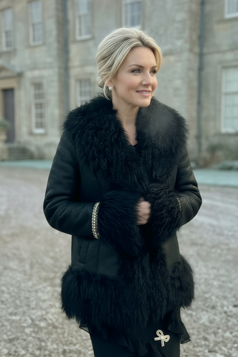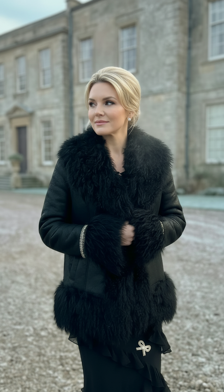 EN KORT SVART JACKA I KONSTLÄDER MED GULDFÄRGADE EMBLEM.