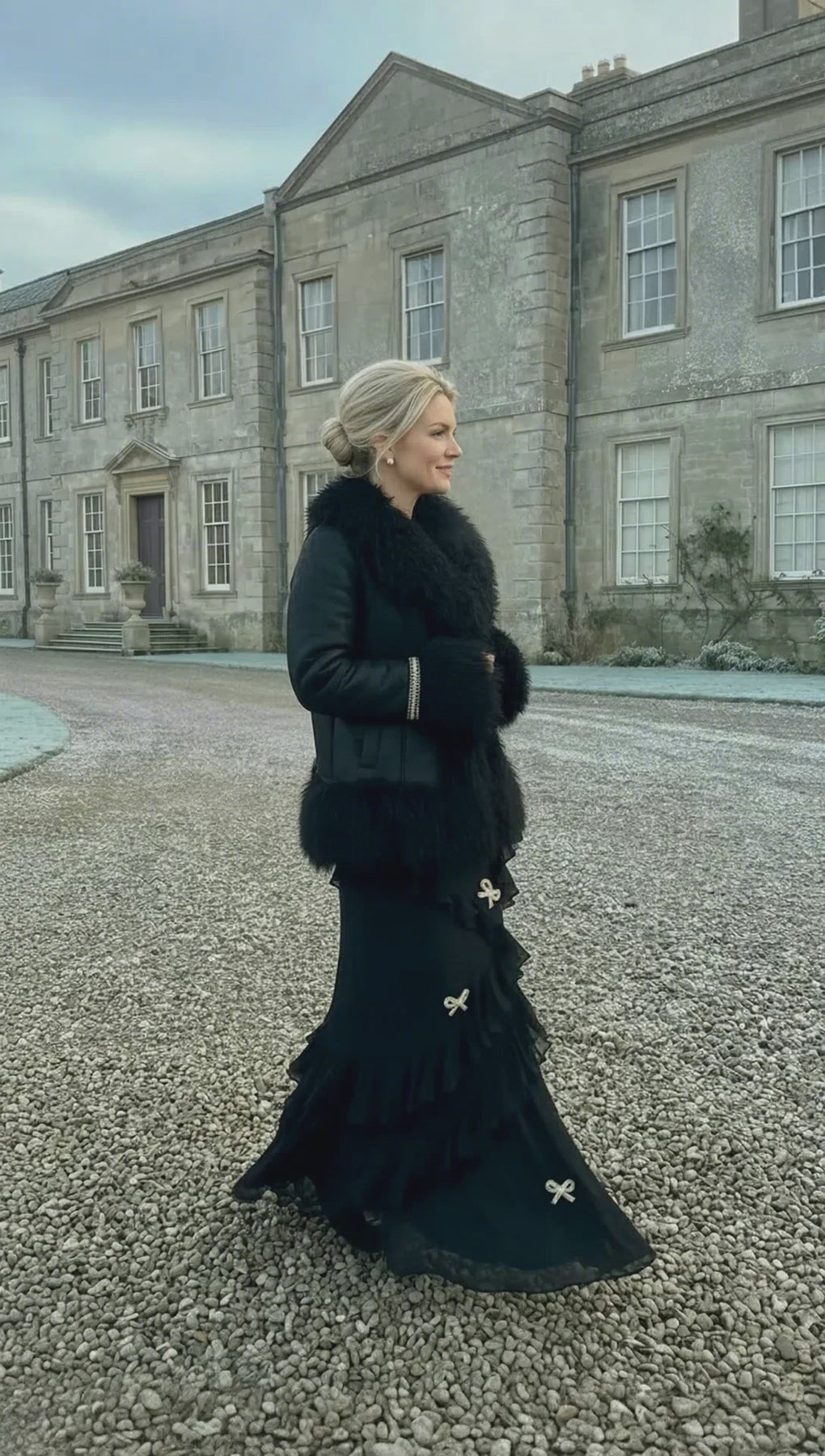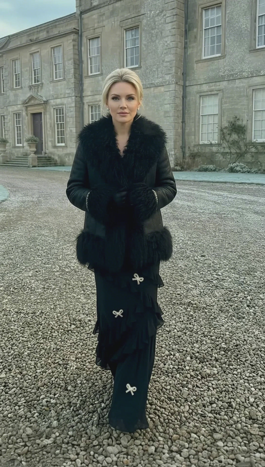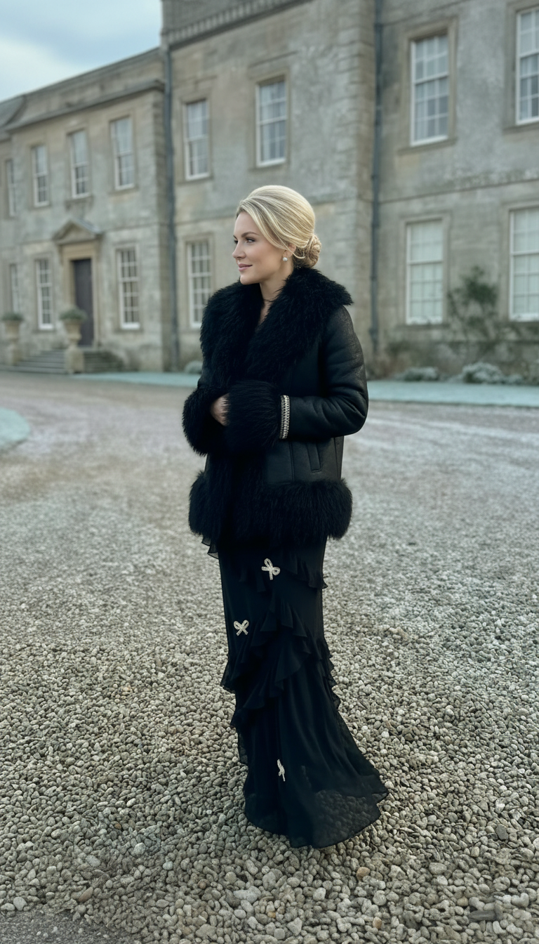 EN KORT SVART JACKA I KONSTLÄDER MED GULDFÄRGADE EMBLEM.