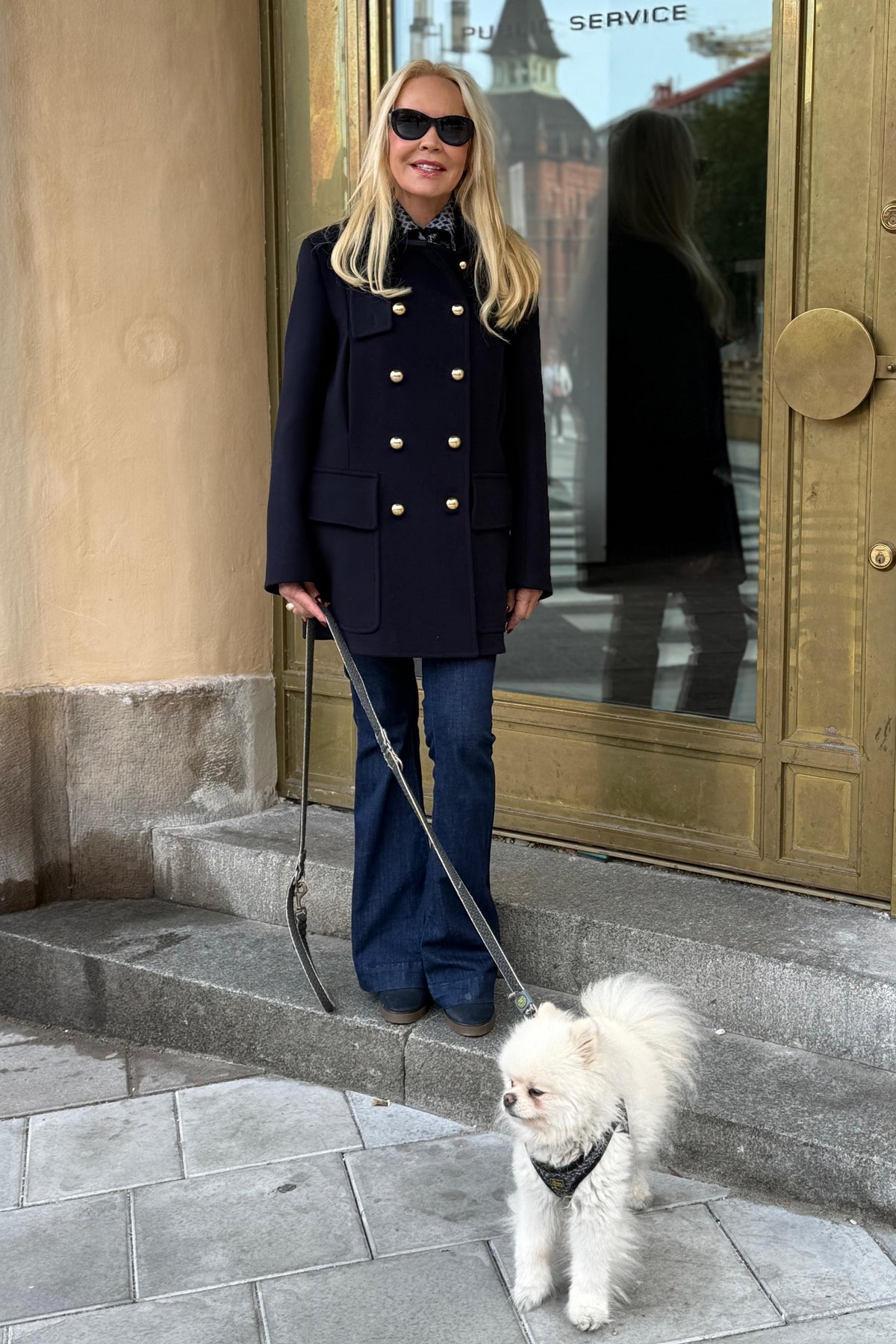 Wool coat with gold buttons in navy blue.
