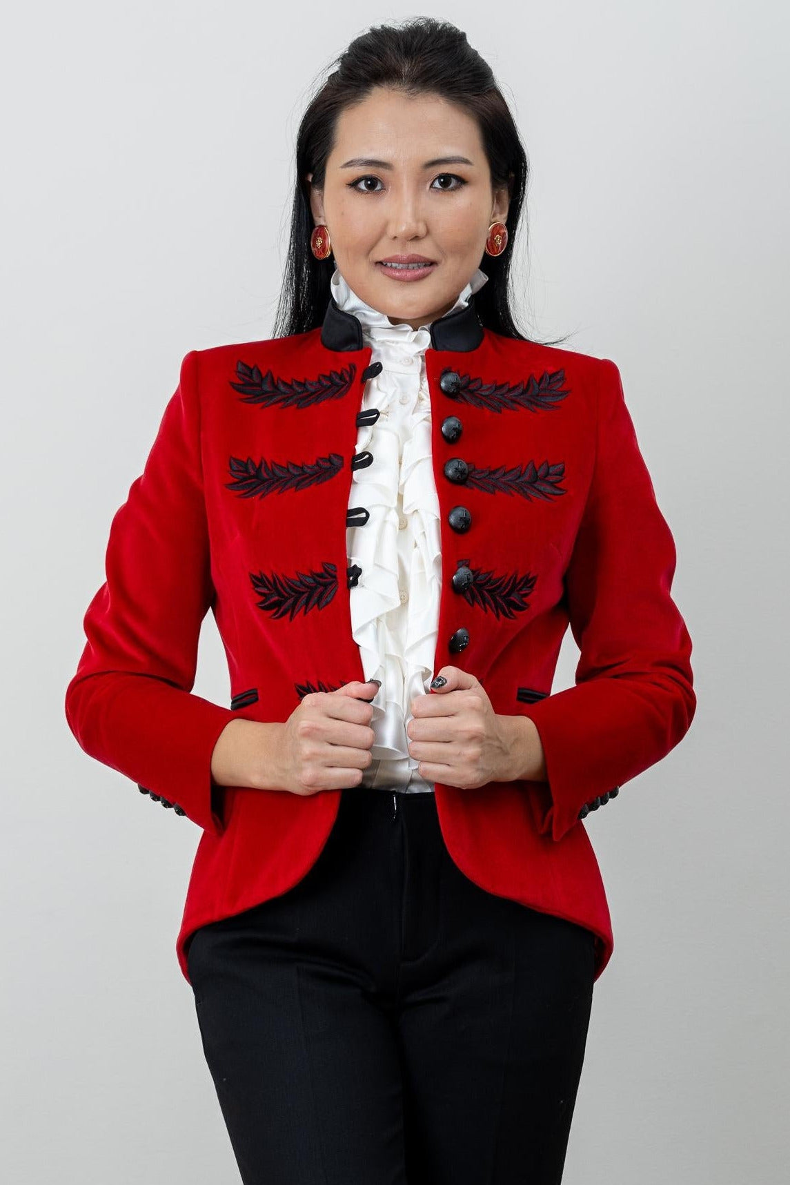 The RENATA VELVET RED BLAZER is more than fashion—it’s a statement of style and awareness. This exquisite red velvet tailcoat, crafted with our brand’s iconic pattern, ensures a flawless fit that enhances the feminine silhouette with timeless sophistication.